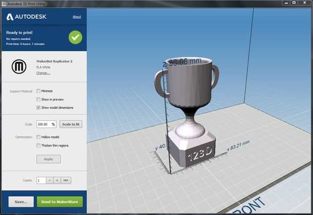 3. después de cambiar algunas opciones, botón de 'Enviar a MakerWare' enviará este modelo directamente a MakerWare.