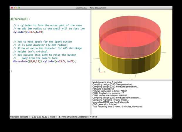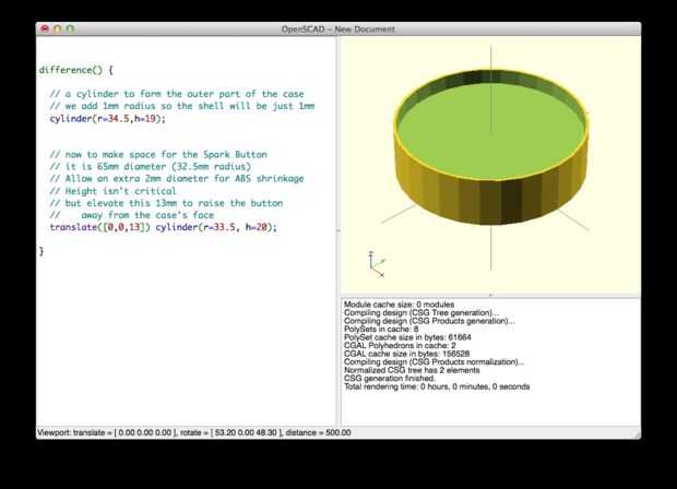 Para comenzar el modelado en OpenSCAD, empecé con dos cilindros. El botón de la chispa es de 65mm de diámetro o radio de 32,5 mm. Ya estoy imprimiendo esto en plástico ABS, que reduce un poco, decidí dejar de 67mm de espacio para la Junta. Primero defino lo que es el segundo cilindro en mi modelo, un radio de 33,5 mm y una altura de 20 m m (que no es crítica siempre y cuando sea más alto que el cilindro externo). Esto realmente será restado de la botella más grande que el exterior de la caja. Entonces defino el cilindro más grande con un radio de 34,5 mm y una altura de 19mm. Utilizar el operador difference(), que le dice a OpenSCAD restar la forma 2ª de la primera. Utilizar el operador translate() para subir el cilindro interno de la planta para que se sienta 13mm por encima de la base. Aquí puedes ver el cilindro segundo, interior en rojo. Una vez que se resta, te queda un cilindro con un agujero poco profundo en forma de cilindro en la parte superior.