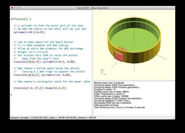 Ahora tengo que cortar un agujero para el cable de alimentación. Utilizo mis medidas anteriores para definir un cubo de 12mm de ancho y 13mm de alto. Utilizar el operador translate() elevarlo 2mm por encima del suelo (eje z). Yo también uso translate() al centro del cubo, desde cubos en OpenSCAD no están centrados en los ejes como cilindros. Así que necesito mover el cubo-6 mm (mitad de la anchura) en el eje x. Entonces también translate() del cubo-37 mm en el eje y para moverlo a la capa exterior de la caja. Aquí se ve la abertura del cubo en color rojo.