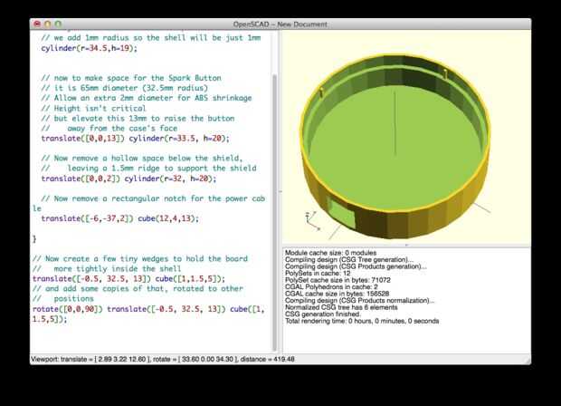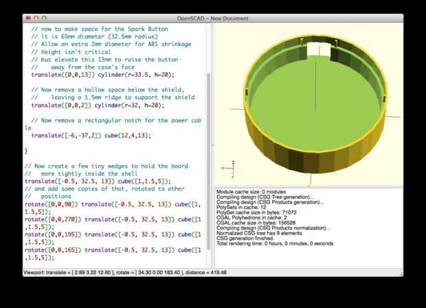 Ahora agrego unos pequeños puestos en el interior de la cáscara del caso a la Junta Directiva de la cuña en su lugar. Estas pueden fácilmente recortarse o lija para ajustar firmemente la Junta. Definen un cubo pequeño (1mm x 1.5 mm) y utilice translate() para colocar en el interior pared de la cáscara del caso. Luego hacer unas copias de esa entrada y utilizar rotate() para mover las copias en el interior de la cáscara para apoyar en los cuatro lados.