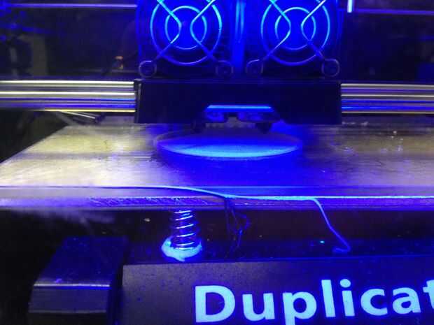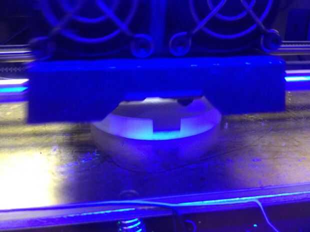 después de mucho ensayo y error aprendiendo a usar la impresora 3D de máquinas tipo A estoy imprimiendo mi primera pieza a dar como regalo. La pieza fue descargada thingiverse y es ayuda de cuchillo para ayudar al cortar objetos duros con un cuchillo
