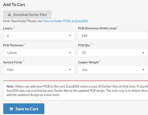 Directamente puede pedir PCB que diseñado de EasyEDA. Solo tienes que pulsar la "salida de fabricación" botón usted será redirigido a la página de la orden de PCB , rellena tus datos y obtendrás el PCB entregado directamente. En esa página puedes hacer un pedido rápida y fácilmente, usted conseguirá su PCB algunos días más adelante.