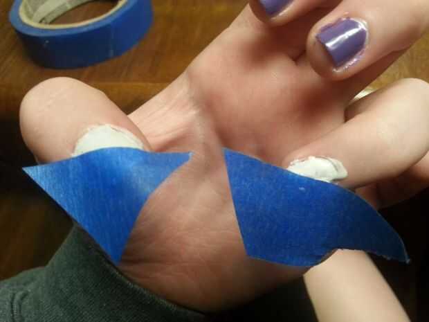 Por su izquierda dedo anular y pulgar derecho ponen dos trozos de cinta en sentido contrario como en el paso diez pero que todavía cubre la mitad superior de la uña.