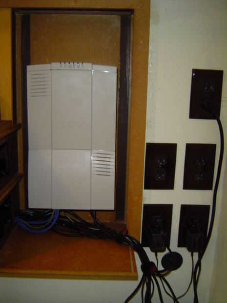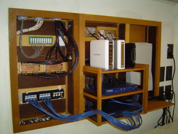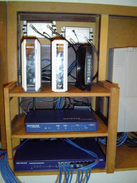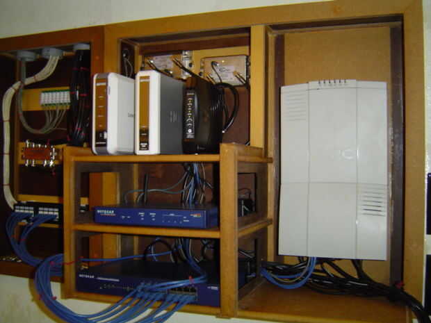 Usé los paneles de pared de madera (masonite) y MDF (1/2" a 3/4") para crear estos estantes. Tubería de PVC para cables en ático.