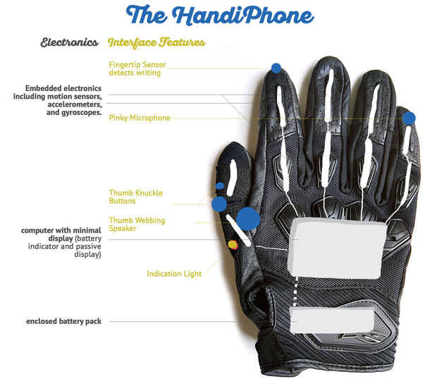 Este es el diseño básico de la HandiPhone. Interfaz de usuario externa es en azul/amarillo. Componentes internos en blanco. Cosas de ordenador externo, integrado en color gris.