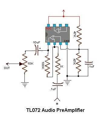 que quería escuchar lo que sonaba la señal pero no se sentía como si la lógica IC podría suministrar suficiente energía para construí este preamplificador para el circuito. Resulta que el preamplificador es débil también, pero me funciona. Adaptado este circuito de otro esquema que encontré en Internet, pero usé un amplificador operacional de TL072 a diferencia de lo que pedía ese circuito. Me imagino que cualquier sola fuente amplificador operacional IC funcionaría aquí.