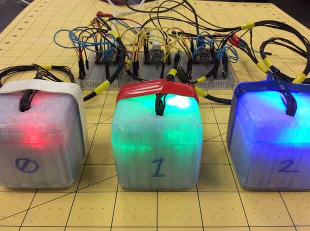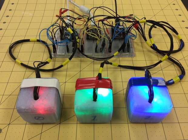 En las primeras etapas, por ejemplo, tomé la decisión de omitir casi toda la electrónica del recinto. En su lugar, coloqué toda la electrónica en breadboards y encadenan paquetes de cables de puente largo entre el circuito de breadboarded y los pocos componentes dentro del módulo (es decir, la luz para la regeneración) y la IMU para la detección de la orientación y el movimiento de los módulos. Lo hice para un número de razones. En primer lugar, fácilmente podría acceder y cambiar el circuito ya que necesitaba, sin tener la necesidad de desmontar las cajas y sacar de la electrónica. Pensé que esto tomaría mucho tiempo desde que fue experimentando aún con componentes y todavía estaba usando un protoboard. Al mismo tiempo, esto. Para mí, la lección aquí es que haciendo compromisos en una faceta del proceso de creación de prototipos (electrónica) puede acelerar otra faceta (reduciendo el tamaño de la caja para aproximar el tamaño final), así también cambiando el contexto en el que usted considere las facetas individualmente ("oh la electrónica realmente no se ajusta, por lo que tengo que reconsiderar mi enfoque" y "oh que el tamaño del recinto se siente bien cuando sostengo en mi mano") y juntos ("para que lo sienta sobre este bien en mi mano, la electrónica necesita ser reducido mucho"). Este tipo de pensamiento fue continuo durante todo el diseño del sistema.