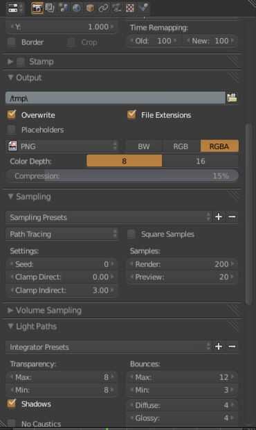 OK, última cosa, te lo prometo. Facilitar el procesamiento en el ordenador, ir a en la primera pestaña en el panel Propiedades, cambiar tres cosas. Bajo muestreo, cambiar la "abrazadera indirecta" en configuración de a 3 y cambiar las muestras de "Render" a unos 300. Se puede jugar con las muestras de render más adelante si lo desea. Por último, en la pestaña de "Senderos de luz", cambiar "Filtro brillo" a 0.5. Y eso es todo!