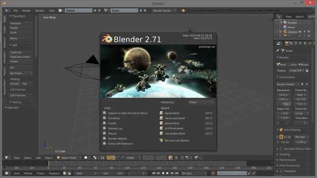 Ir a www.blender.org y descargar la última edición para cualesquiera especificaciones el equipo tiene. Una vez que han descargado e instalado blender, arrancar. La versión que tenga una pantalla de bienvenida diferente, soy un poco detrás en mi versión :)