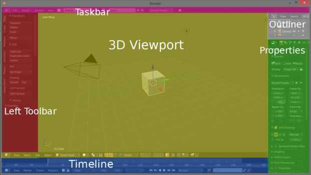 Además de navegación, tenga en cuenta las diferentes ventanas. Mantendré este breve y a la acción. La zona muestra la vista 3d con el cubo por defecto, la cámara y la luz. La parte superior (púrpura) es la barra de tareas, esto vendrá más adelante. La izquierda es la barra de herramientas, no esto utilizamos mucho. La derecha es las propiedades, que vamos a usar mucho, así que recuerden su nombre. La parte inferior es la línea de tiempo, que se utiliza más para la animación. Finalmente, poco en la parte superior derecha (blanco) es el outliner, que muestra todos los objetos en la escena. Esto es muy útil para la referencia.