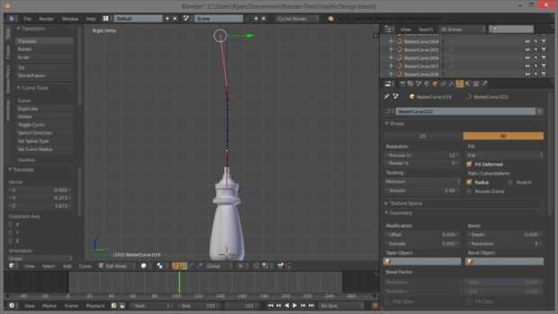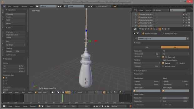 El alambre en la parte superior es una curva. Usando el mismo proceso como lo hicimos para los filamentos, añadir un hilo y hacer un poco rizado, así que no es sólo una línea recta. Aumentar la configuración del bisel hasta que el cable es lo suficientemente grueso, y se acaban la lámpara!