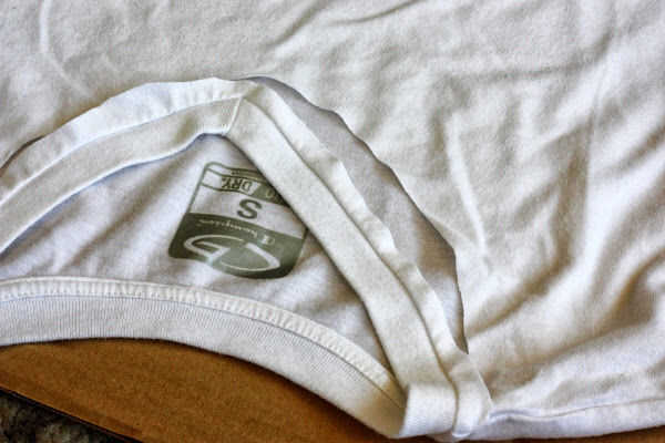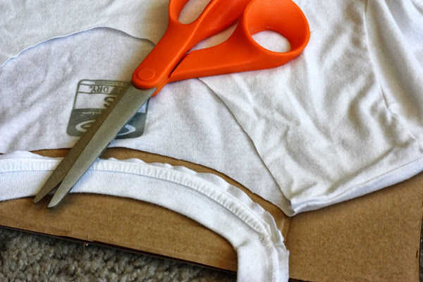 Modificar la camiseta para ser la forma que desee. No fray tejidos de punto, así que no necesitaba nada de dobladillo. He hecho esta camiseta blanca en un tanque ocasional. Se ha cambiado el cuello, cortar las mangas y cortar el dobladillo (para emparejar los bordes y algunos no encerrados mientras que otros no lo eran). Generalmente utilicé las existentes las costuras y los dobladillos como guías para asegurarse de que mis cortes son rectos.