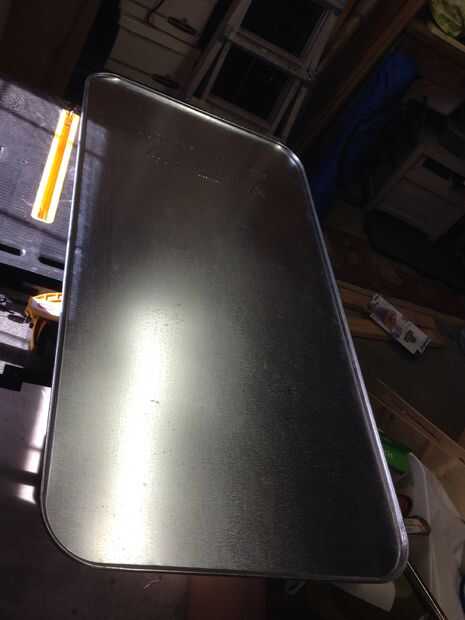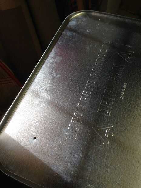6. decidir qué lado del metal a utilizar. (Utilicé la parte trasera de mi bandeja de goteo porque quería que la mayor profundidad de la pared)