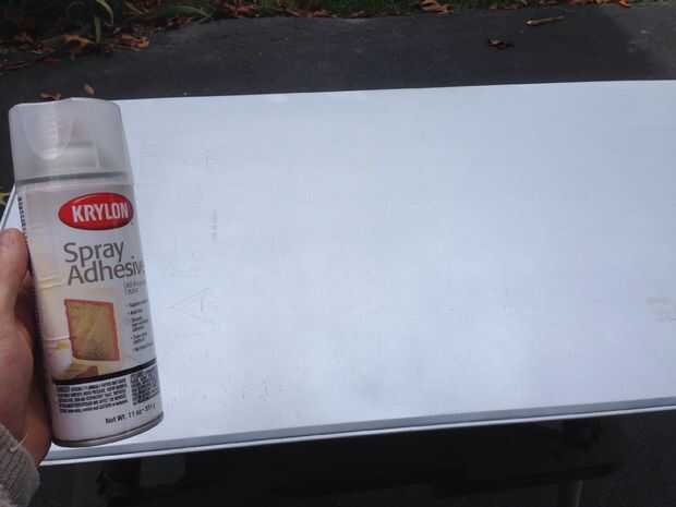 2. rociar el pegamento en el lado que desea utilizar de la superficie del metal.  (No preocuparse por los lados o hacia atrás todavía.  Sólo se centran en la parte superior.)