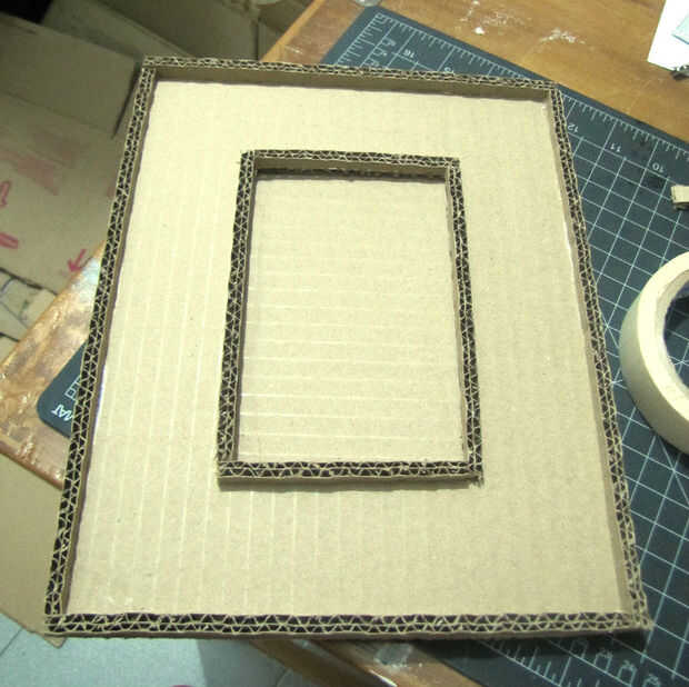 - Cortar 4 finas tiras de tablero y pegar en la parte posterior del marco que forman caja para la foto (imagen 5) y la pieza rectangular que se creó en el paso anterior quede dentro (imagen 6)