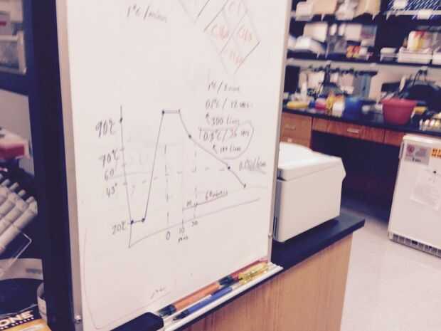 - Es importante calentar la parte superior del termociclador a 105 ° C para evitar la gradiants de la temperatura en el sistema. Si la temperatura de la parte inferior del termociclador es alta y la temperatura de la parte superior del bajo, el sistema se evaporará en la parte inferior y las sales se placa de la solución, llevando a una sustancia cristalina blanca no deseada que aparecen en la parte inferior del tubo