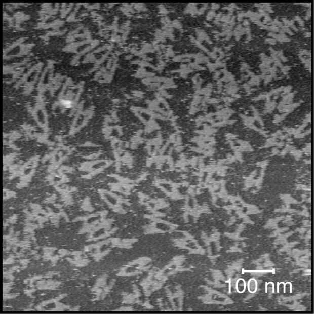 Una vez que el sustrato se carga en la AFM, hemos calibrado el sistema. El AFM fue utilizada en modo bajo líquido fase. Utilizamos un gran ventanal de ~ 6 um para obtener un gran campo visión de las nanoestructuras. Muchos muchos muchos 'Como' llegó a ser cada vez más visible como enfocamos la máquina. Una vez que tuvimos un asimiento en el sistema, nos zambullimos más profundo en los detalles para resolver imágenes de resolución más alto de nanoestructuras individuales.