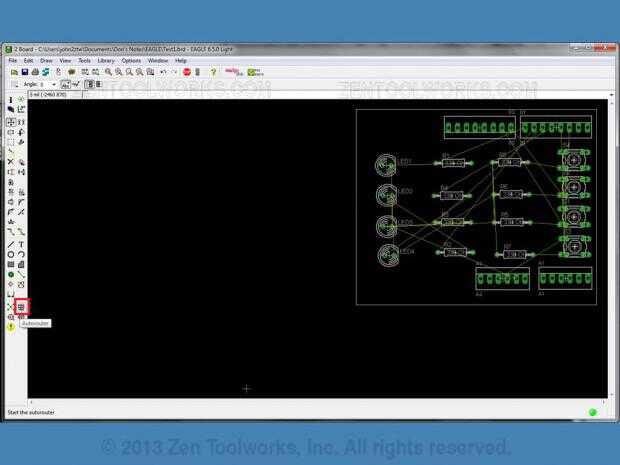 • Ahora que nuestro tablero es listo ahora podemos ruta para conseguir listo para donde va la máquina CNC para cortar. Así que vamos a utilizar la función Autoruter para lograr este objetivo. Es el botón que se parece a una malla de cables azul y rojo.