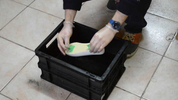 Puede crear pequeñas asas con cinta para ayudar a sostener el objeto. Colóquese los guantes y sumerja la pieza lentamente. La película se ajusta a las formas. Incline el objeto a 45 grados para evitar grietas y pliegues. Caras planas deben entrar con un ángulo.