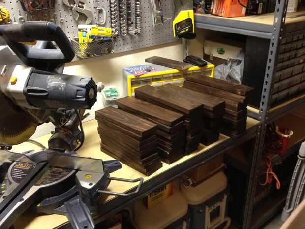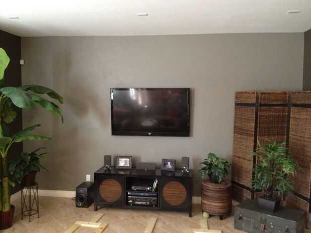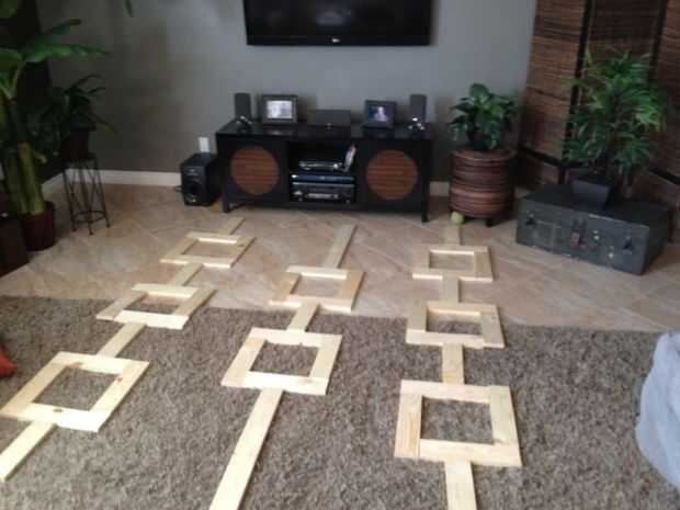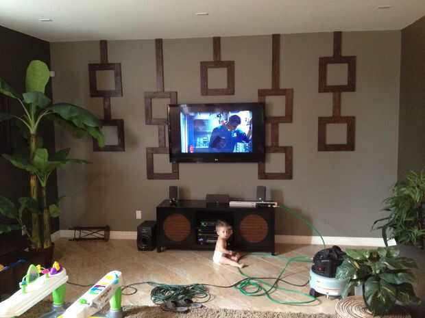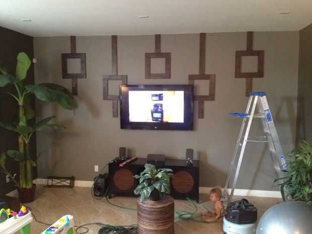 utilicé madera para crear un diseño único de la pared. Después de trabajar el diseño en papel y determinar todas las mediciones, corté trozos de 1 x 4 de madera en los pedazos individuales que necesitaría. En mi caso, hubo 12", 15" 18 ", 30" y piezas. Fue más de 100 cortes en todo! Luego lijar cada pieza de madera para permitir que la mancha y mejor. Entonces teñido cada pieza dos veces para obtener un color café oscuro. Luego vino el final. He utilizado hábil claro acabado, un spray de barniz transparente. Después de la primera capa, utilicé lana de acero muy fina (0000) a cada pieza después de lo cual he aplicado una segunda capa. Cuando la madera fue finalmente preparada, usé un compresor de aire y pistola de aire (utilizando calibre 23, clavitos de 1 3/8 de pulgada) para sujetar la madera a la pared. Usé una cinta métrica y un nivel a lo largo de los clavos para asegurar directamente, incluso líneas. Estoy encantada con el resultado. Es un proyecto muy singular casa que enmarca la televisión y le da a la habitación un toque más moderno y personalizado.
