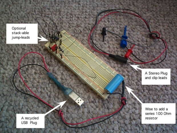 Dispositivos USB tienden a convertirse en un derecho de circuito abierto en la interfaz del conector. Los cables en este enchufe USB fueron conectados con el código de color correcto. El cable de 5V era rojo y el suelo negro. Al parecer una carga de 100mA es una carga de la unidad de USB. Un resistor de 100 Ohm serie fue agregado a la línea de 5V por razones de seguridad.