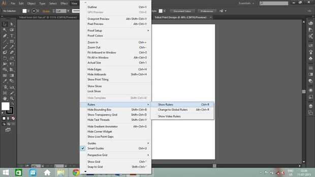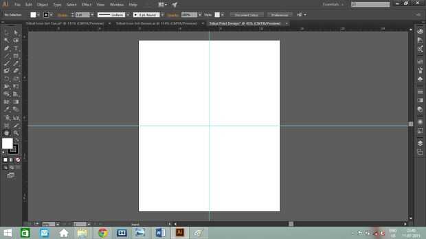 Usando los diseños tribales de vector libre, vamos a crear una impresión tribal única. Ir al nuevo archivo que acaba de crear. Me gusta mis diseños a estar exactamente en el lugar, por lo tanto recomiendo utilizar guías. Si la regla no está visible en el espacio de trabajo, vaya a la Vista – gobernantes – Mostrar reglas. Coloca el ratón sobre la regla vertical y arrastre una guía, dejarlo en 7 pulgadas. Del mismo modo pasa el cursor sobre la regla horizontal y arrastre una guía de 8,5 pulgadas. También asegúrese de que sus Guías inteligentes está encendido (Ctrl + U).