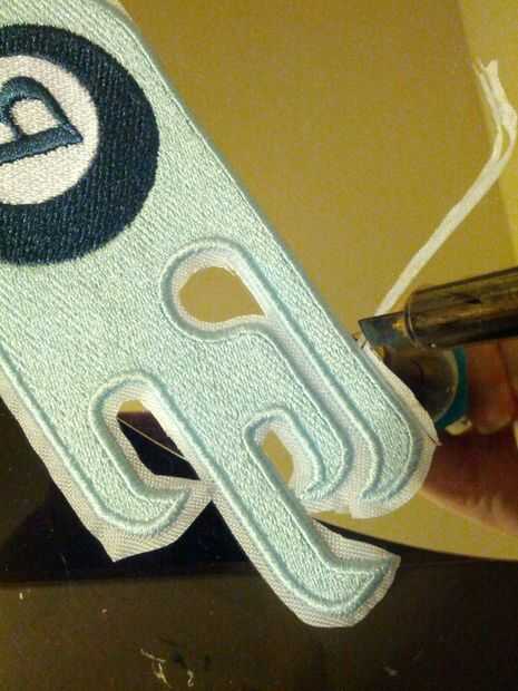 Una vez caliente el hotknife, recorte el exceso de nylon alrededor de los parches. Limpie la mugre derretido apagar el hotknife cada vez que termines un golpe cortado. Puede ejecutar una parte limpia del hotknife a lo largo de un borde para sellarlo aún más.