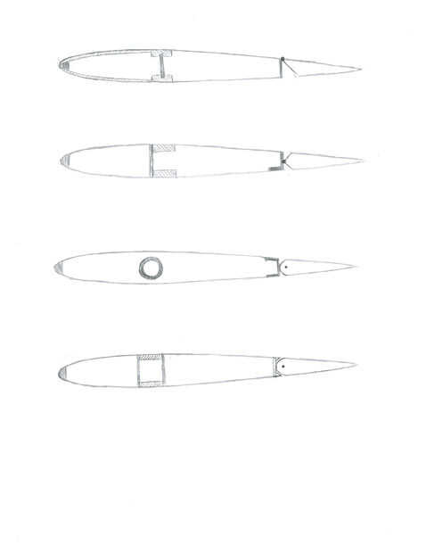 - La tercer ala tiene un mástil de tubo, estos generalmente están hechos de tubos de carbono y son muy convenientes construir, si el tubo de carbono unidireccional/pultruded luego ala torsión puede ser un problema, pero esto puede manejarse con la adición de un tubo de D. Además el mástil de arrastre es una C-beam que aumentaría considerablemente la rigidez del ala. La bisagra es una redondeada superficie de control con el punto de pivote en el punto central del borde circular para reducir al mínimo el boquete de la bisagra y con bordes lisos.