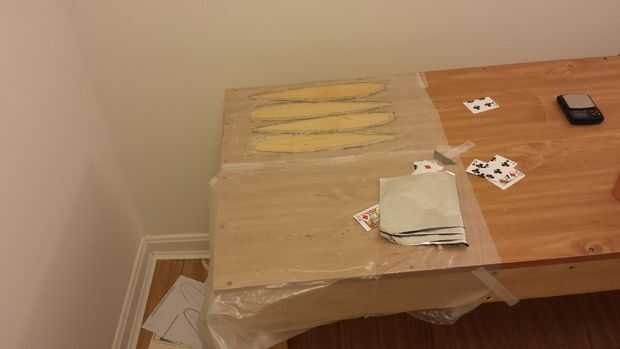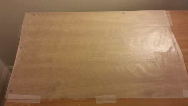- Preparar una superficie de trabajo con cinta adhesiva a una lámina de plástico del pintor para aplicar la fibra de vidrio y resina en.