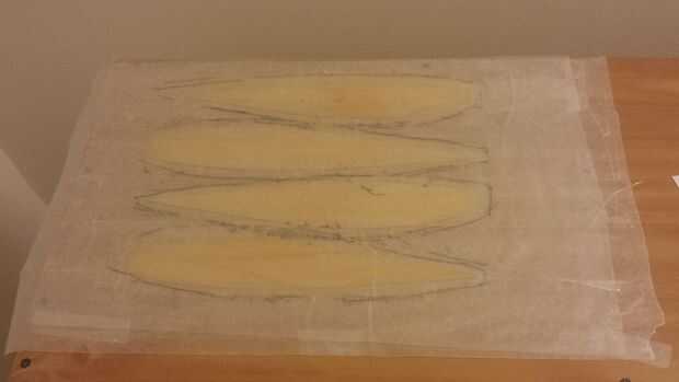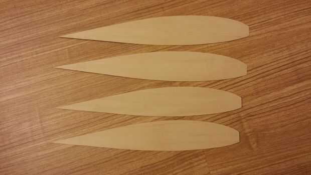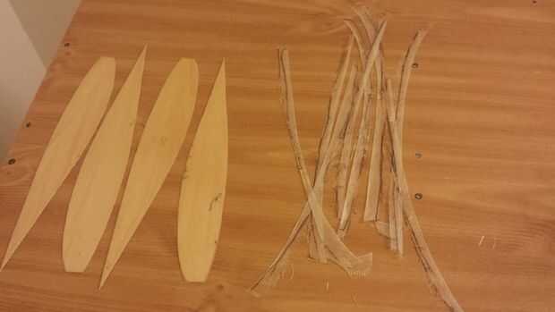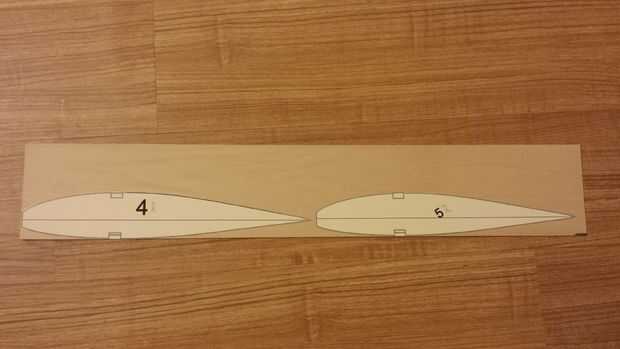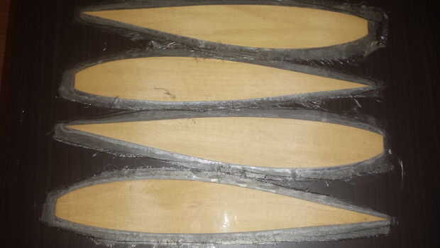 Las costillas que apoyo el tren de aterrizaje debe ser muy fuerte ya que será necesaria para soportar el peso completo del avión y probablemente muchas veces que si el avión cae áspero. Como tal balsa no serían capaces de soportar la carga experimentada por estas costillas, así que en vez de eso que esta las costillas se hacen de 1/32 espesor basswood y 2oz de fibra de vidrio para hacer una compuesto madera contrachapada que es increíblemente fuerte y mucho menos frágil que la madera de la capa de arte. El proceso que se utiliza para aplicar la fibra de vidrio llamado un layup mojado ya que la resina se utiliza para mojar las fibras. Estas costillas experimentará una carga grande frente al mástil sin embargo muy poco detrás de él, por lo tanto mantener el avión como posible el frente de la costilla más fuertemente reforzada de la parte posterior. A continuación es la primera etapa de la construcción de las costillas reforzadas.
