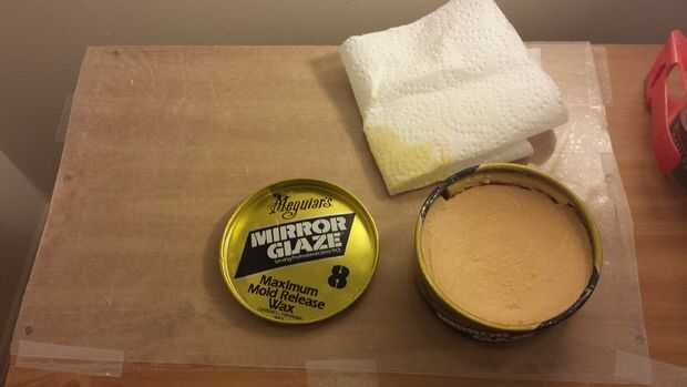 - A continuación preparar las superficies que estarán en contacto con las partes como la cura. Aquí papel encerado se cubre con cinta adhesiva para crear una superficie muy lisa y no porosa. Luego Aplique cera de liberación en la cinta de embalaje con una toalla de papel siguiendo las instrucciones del envase. Como una preferencia personal, uso espejo esmalte molde de cera de Megular de liberación, funciona muy bien con la resina de acabado Z-Poxy que utilizo y una vez curadas las partes separadas muy fácilmente de cualquier superficie lisa donde se aplica la cera. También no deja mucho residuo en las piezas una vez separadas.