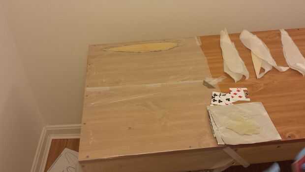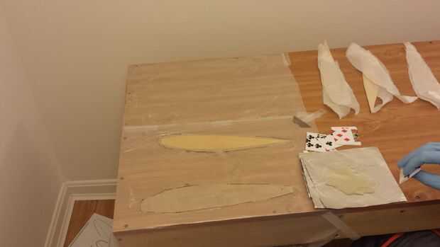 - Vierta alguna resina sobre la tela de fibra de vidrio y uso la rasqueta cubra completamente la tela. La tela cambia de blanco a un color translúcido como absorbe la resina.