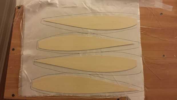 - Traza la forma de la costilla de ala en 2 onzas de fibra de vidrio dejando aproximadamente 1/2" alrededor de las costillas como se muestra en las fotos. es importante que la fibra de vidrio tejido corriendo desde el borde de ataque hasta el borde de fuga y desde el fondo hasta la parte superior de la costilla. Esto maximiza la fuerza de la parte permitiéndole fibras continuas a lo largo de la longitud de la pieza.