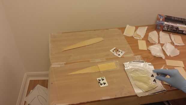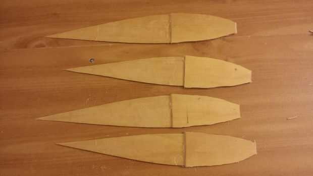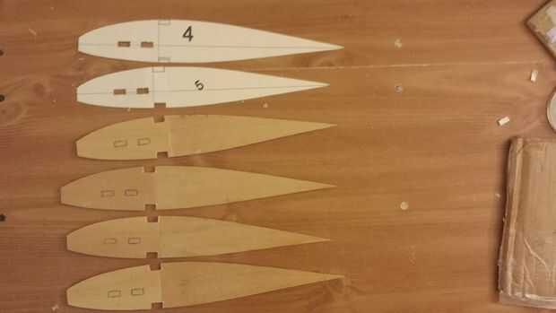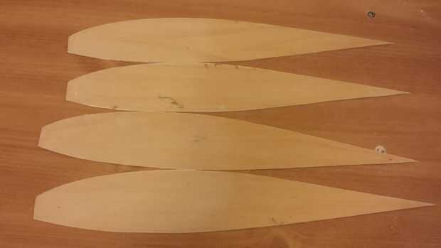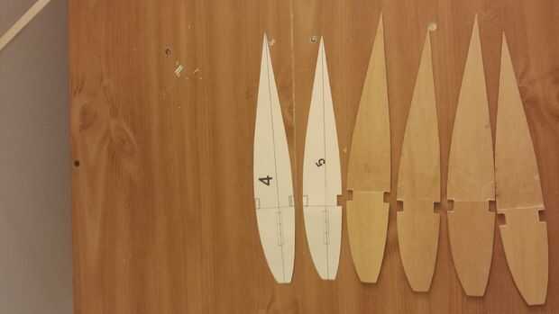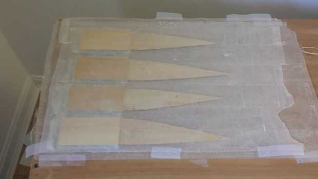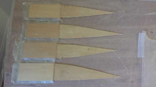 - Cortar las piezas de madera que será laminado en. En mi caso agregué una capa de madera con el grano corre verticalmente y luego un trozo de madera con el grano que funciona en la dirección cord-wise en ambos lados de la costilla. Esto hace que la frente 5 plys de madera gruesa con 6 capas de fibra de vidrio.