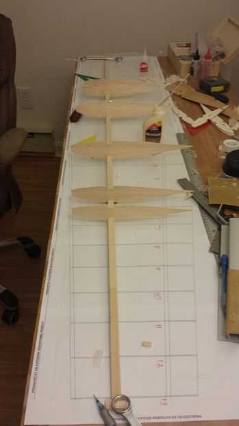- Se aplica woodglue a la muesca del mástil de la costilla más externa. Entonces usando el borde de fuga y la marca en la marca de vanguardia Alinee la costilla para que la marca y el borde de fuga son la misma altura sobre la superficie de trabajo. En mi caso esta alineación me daría los 2 grados de lavado que deseaba. Una vez que la elevación de la costilla es asegurar que es cuadrada con la superficie de la mesa, y que está montado en línea con las costillas en el plano del ala.