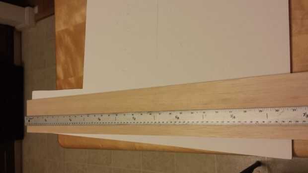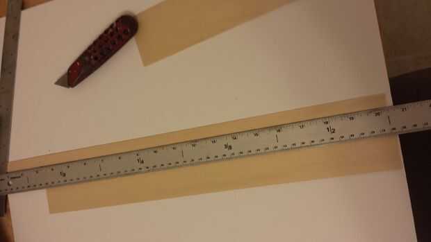 - Siguiente corte una cara tira de balsa 1/4 de una hoja. Para cortar una tira larga de material más fácil con una maquinilla de afeitar simplemente poner cinta de doble cara en la parte posterior del borde recto y hará la tarea increíblemente fácil puesto que el borde no se mueva durante el corte. También no trate de cortar el material en un solo paso, ya que aumenta las posibilidades de partir la madera. En su lugar hacer unos pases luz para cortar todo el camino a través.