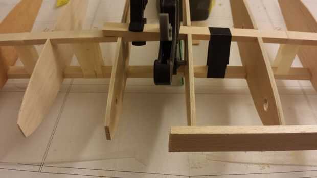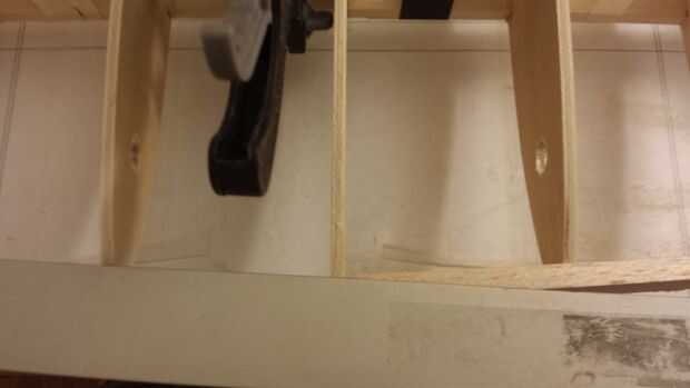 - Use CA gruesa para pegar el sub de vanguardia a las costillas. He encontrado que es más fácil de aplicar el pegamento a la costilla de extremo y luego alinee la tira con la costilla de centro. Una vez que el pegamento se haya secado luego aplicar pegamento a las costillas de algunos próximas. Tenga cuidado de no doblar las costillas que se pega el borde sub mientras pegado a las costillas nuevo.