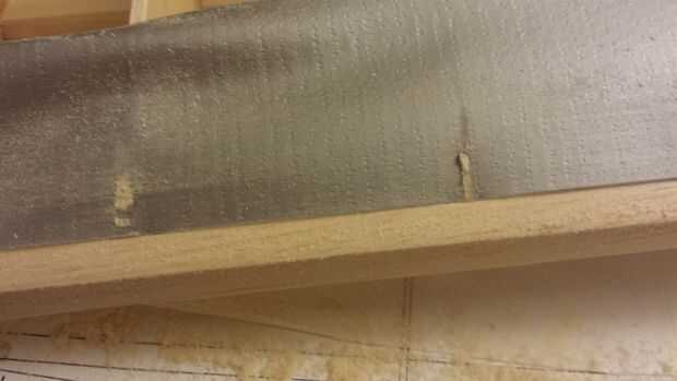 - Una vez que la vanguardia sub está cerca de la forma de la superficie superior e inferior deben preparar el ala para el lijado. Aplique un trozo de cinta adhesiva a lo largo de las costillas que se lijar delante. Esto protegerá las costillas y servir como una guía para lijar.