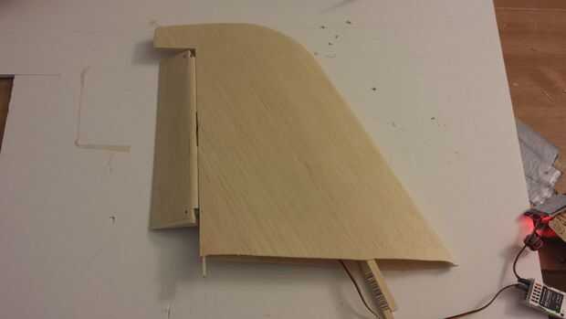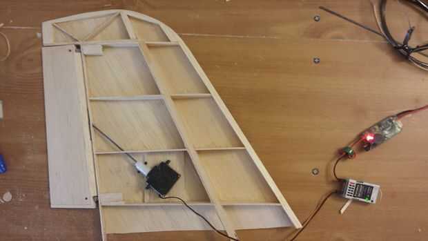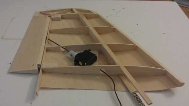 - Perfore un agujero hacia abajo a través de las costillas para permitir que el cable de servo salir fuera de la base del estabilizador vertical.