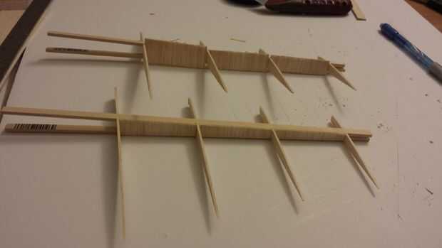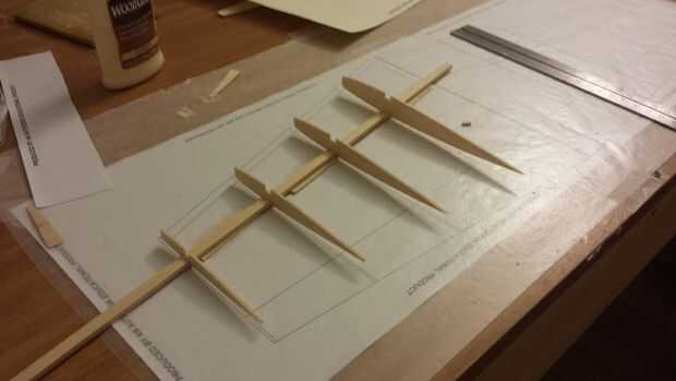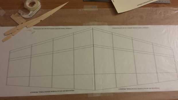 - Cortar el mástil elevador hecho de basswood 3/16 x 1/8 de longitud, nota que este mástil es 4 piezas y que se reunirán en forma de V. Luego coloque el mástil estabilizadores en los estampados azul asegurándose de sostener la punta de modo que el centro del estabilizador horizontal.