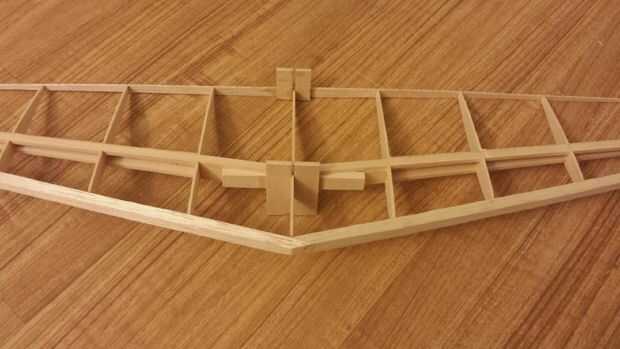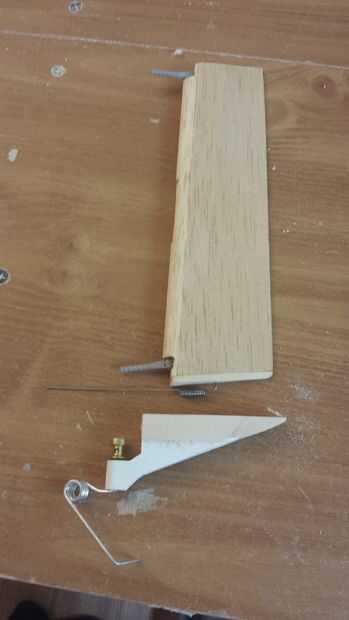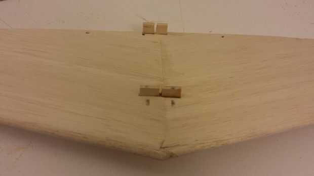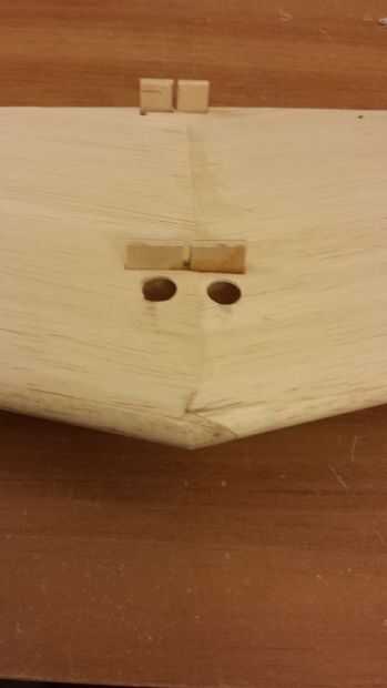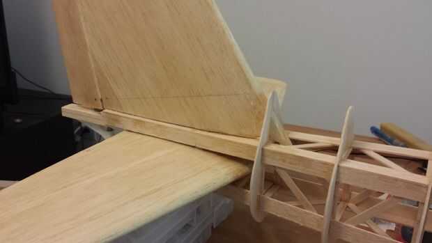 - El estabilizador horizontal ya tiene soportes conectado directamente a su mástil, sin embargo tendrán que instalarse para fijar el ángulo correcto con respecto a las alas. Se trata de un proceso de ajuste seco repetitivo donde el ángulo está ajustado por lijar el soporte trasero.