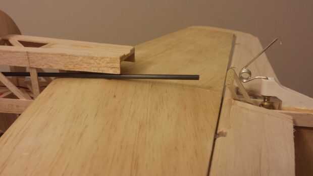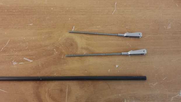 - La barra de control para el elevador debe hacerse ahora mientras hay fácil acceso en el fuselaje. Se hace de un tubo de carbono de 4mm con varilla roscada de 2-56 ajustaron aproximadamente 2 pulgadas en el tubo en ambos extremos. Esta configuración reduce el peso de los versos de la varilla de control un metal comparable y es más fácil de configurar que las barras de control de tubo de plástico. Además el tubo de carbono es muy duro que reduce el slop en la configuración del control con hacia fuera tener que añadir guías dentro del fuselaje. Las abrazaderas tienen rosca a la varilla, uno de los cuales con cerradura para evitar que la varilla de empuje de poder girar y desenroscar de la horquilla de la pisada.