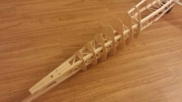 - En este punto el estabilizador vertical es una estructura independiente que debe estar conectada en la armadura que forma el fuselaje. Para ello los segmentos de la spar que están pegando hacia fuera tuvo que ser unido firmemente. Comencé haciendo agujeros preliminares en la cubierta superior de la truss para permitir que la superficie de prueba montado.