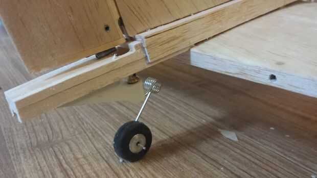 - Opté por instalar el soporte de la rueda de cola hacia atrás en comparación con el previsto. Esto se hizo para crear un más apretado trasero del avión para descender suavemente en un punto. Se ajustaron en un bloque de tilo que se conecta en los rayos de la rueda de cola que se extienden fuera del fuselaje.