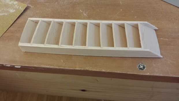 - Utilizando un trozo de pieza de 1/2 x 1/16" balsa como base establece el ángulo de las aletas y pega el primero de ellos con CA.