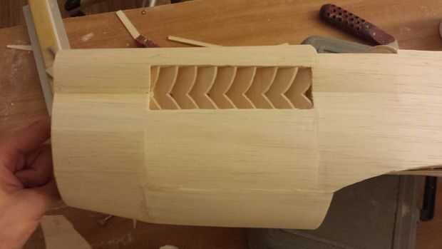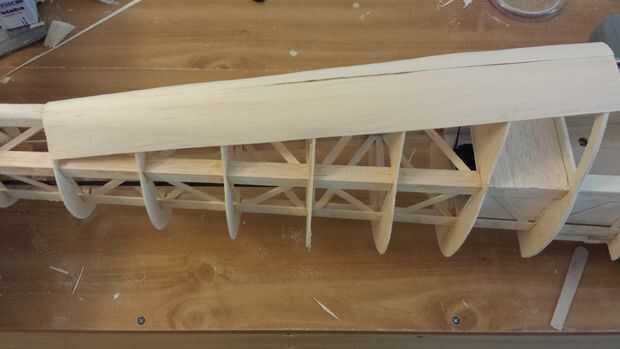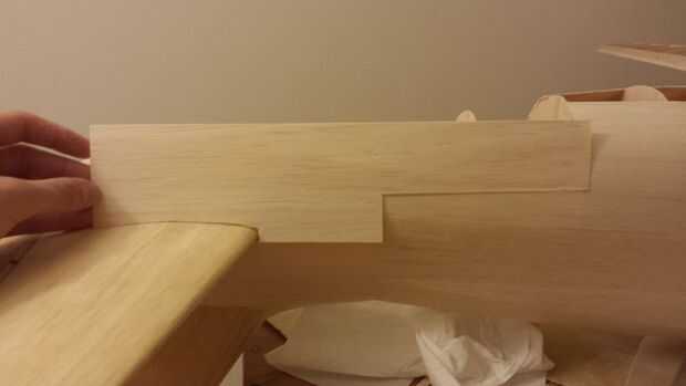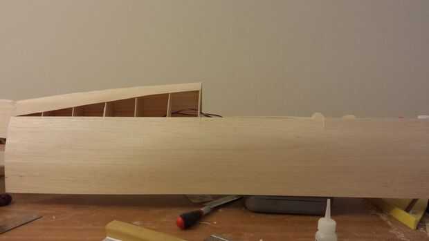 Láminas deben hacerse en cualquiera de los dos pedazos más pequeños para que existan curvas complejas para negociar o en grandes hojas cuando las líneas del avión lo permiten. La clave en láminas lisas y apretadas juntas es ajuste en seco una y otra vez y marque ligeramente marcas de alineación de las piezas se cubrieron para ayudar a alinear el trabajo cuando pegando. Además todas las juntas deben ser bufanda juntas con al menos una superposición de 1/4". Esta superposición permite que las articulaciones se unan suavemente y también les permite lijar después de la chapa en su lugar. Si los contornos están muy afilados, encontrarás que la piel a tratar en otro lugar se propagan. Todavía es posible cubrir esta área sin embargo, requerirán más de una pieza de la cubierta. Para curvas muy cerradas balsa sólida deberá ser utilizado, como el final del fuselaje inferior donde sale la varilla de empuje de ascensores o la cúpula del jorobado en el timón. Cuando la chapa es mejor instalar un soporte para pegar en una esquina, un ejemplo sería a popa del servidor de seguridad frente a los orificios de que la chapa viene a una "V" y debajo de la chapa es una pieza de balsa lijada a una "V" que podía pegar de apoyo. Ser paciente y ser suave con la cubierta en esta etapa es muy fácil crackearlo