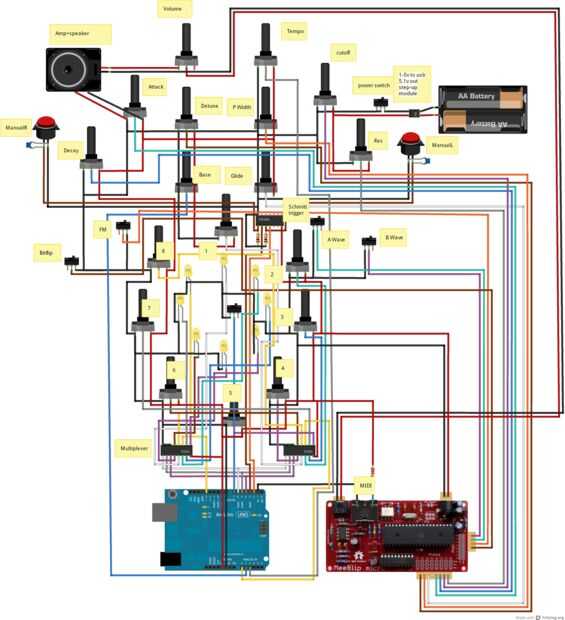Otra cosas es el uso del disparador de Schmitt de invertir. Esto, en combinación con el resistor y el condensador, hace que los botones Manual evitar rebotes y causando una nota activará doble. (Esto se complementa con piezas contra rebotes código Arduino). Revisa esta página para más información.