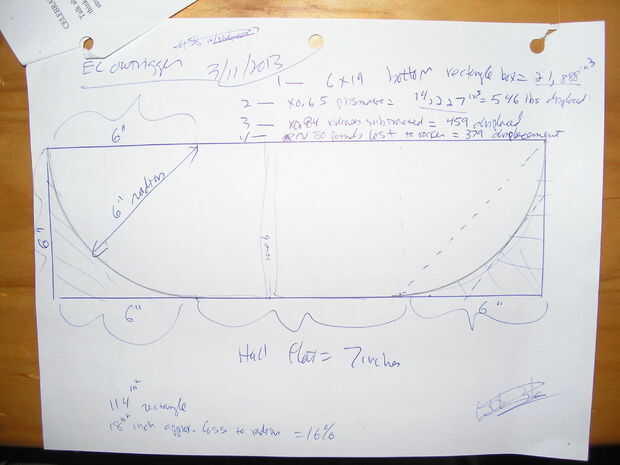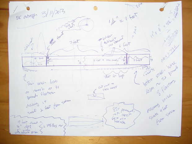 Ahora libre de la mente: bosquejo. Mucho debe planificarse: longitud (16 pies), anchura (19 pulgadas en el centro), profundidad (15 pulgadas para el casco de madera y algunas pulgadas de fiberglassed y forma espuma de células cerradas en la parte inferior: Esto proporciona forma eficiente inferior y flotación para permitir una cabina auto achique).