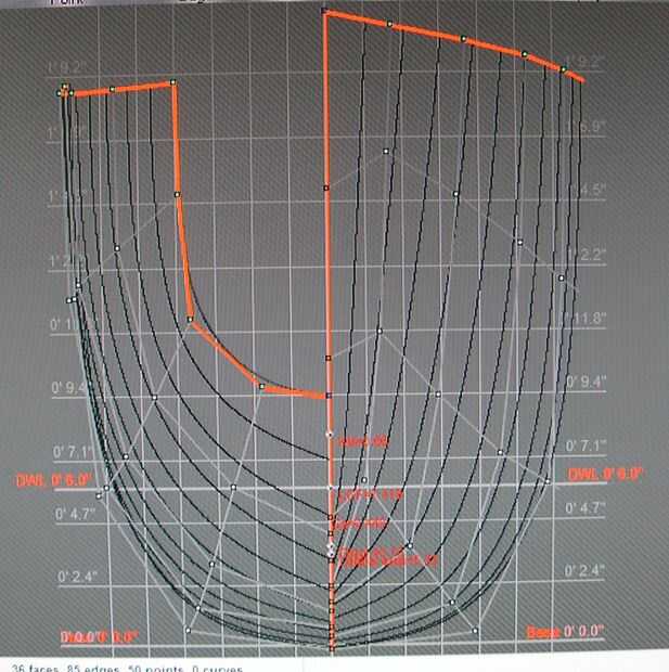 La forma de fondo generados por computadora le quita más desplazamiento que había imaginado--para la navegación de día, no es un problema, pero para el requisito de llevar engranaje de Everglades desafío, tal vez un pequeño problema. Metí con las líneas recomendadas (ver segunda foto) para añadir más desplazamiento manteniendo el "espíritu de las curvas", pero ¿qué sé? Regresé ~ 40 libras de desplazamiento pero a costa de unión atornillada con una fórmula de alguien de forma parte inferior mejor. Como dije en el paso anterior, tal vez la colocación del peso de la tripulación reemplaza los puntos más finos de estos temas.