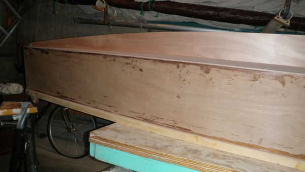 El casco básico se realiza (~ 16 pies de largo, 15 pulgadas de profundidad en el centro, 22 pulgadas de ancho en la parte superior, 20 pulgadas de ancho junto a la línea de flotación). Sólo he hice la web pura con la curva del eje de balancín en él, y debe ahora pegamento en las losas de la espuma, la unidad en la parte inferior de la madera contrachapada del pegamento, forma la espuma y todo el casco de vidrio en el exterior (varias capas sobre la espuma).